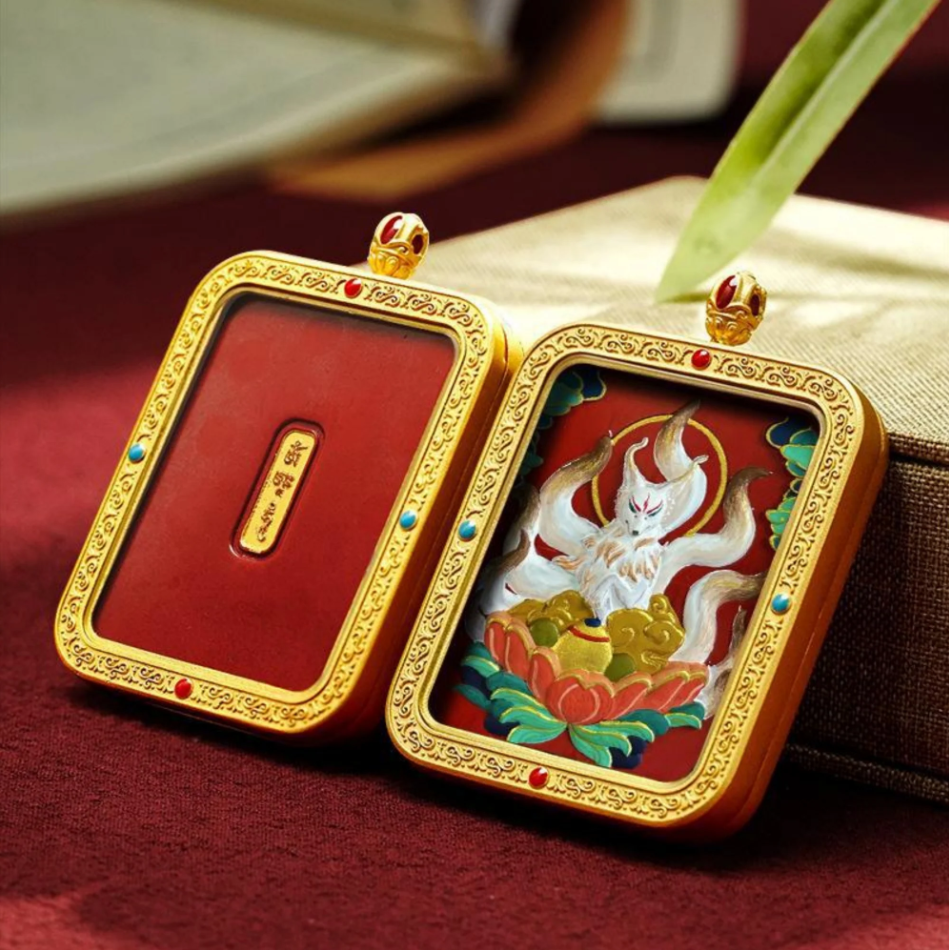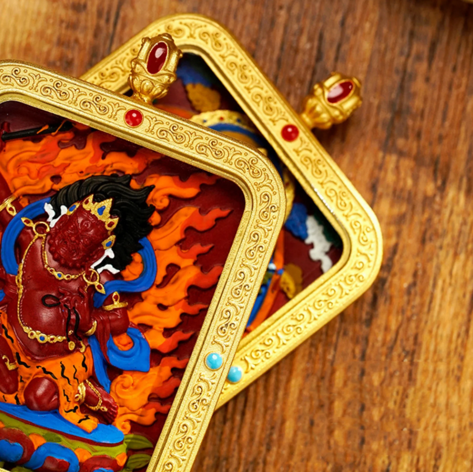 Hand-painted Thangka of Vairocana, set in a traditional Ga Wu box — a wearable shrine that carries light, wisdom, and protection close to your heart. Link in bio.