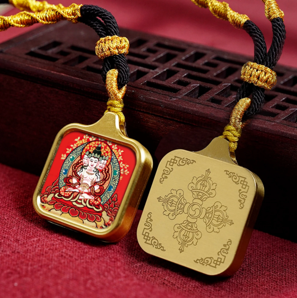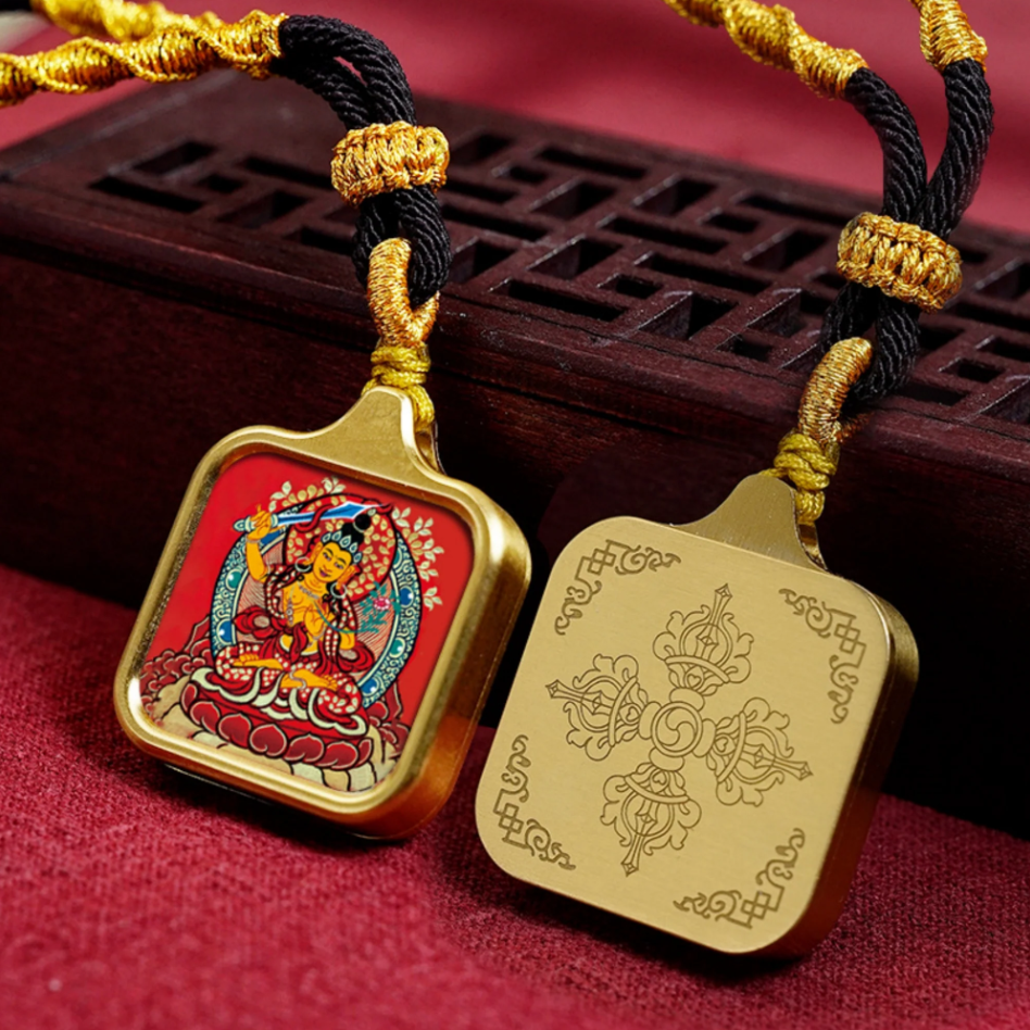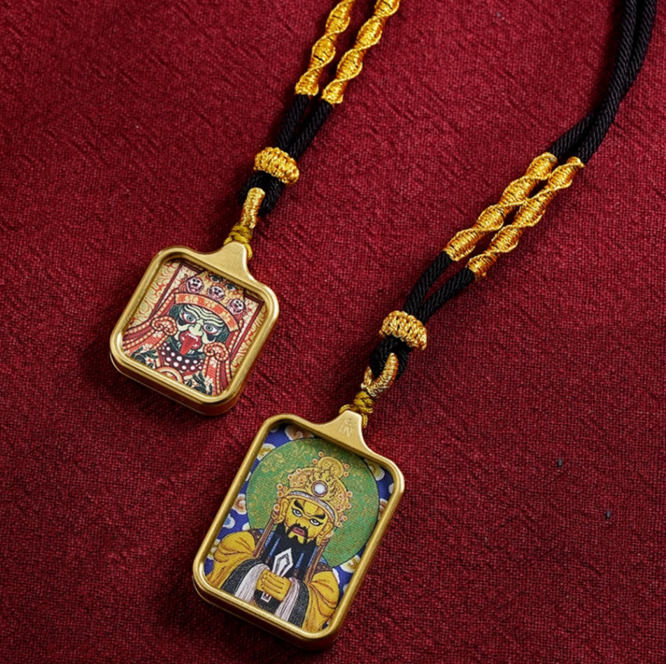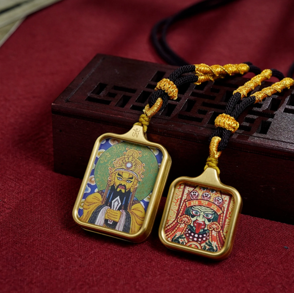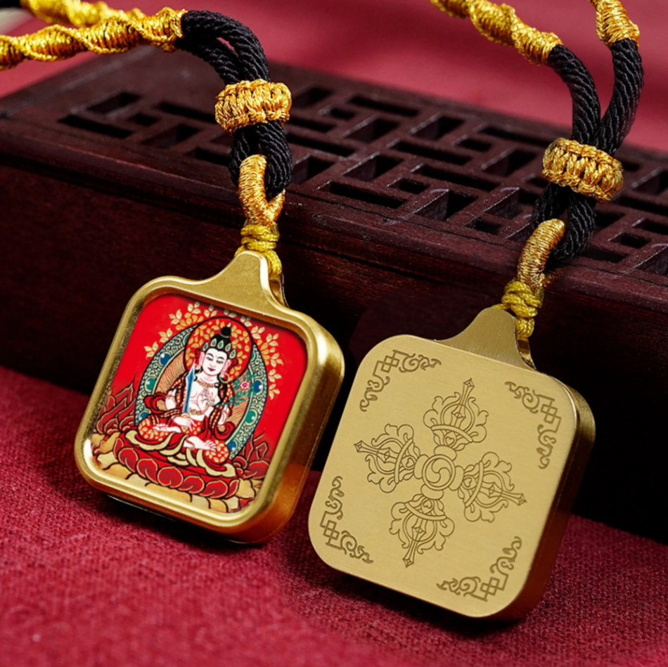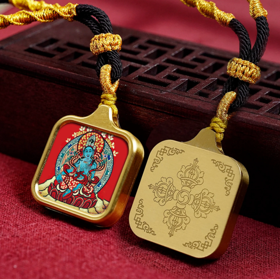Hand-Painted Thangka: Each pendant is adorned with meticulously hand-painted Thangka, a traditional Tibetan Buddhist art form depicting sacred deities and symbols. These intricate designs showcase vibrant colors that represent the divine.