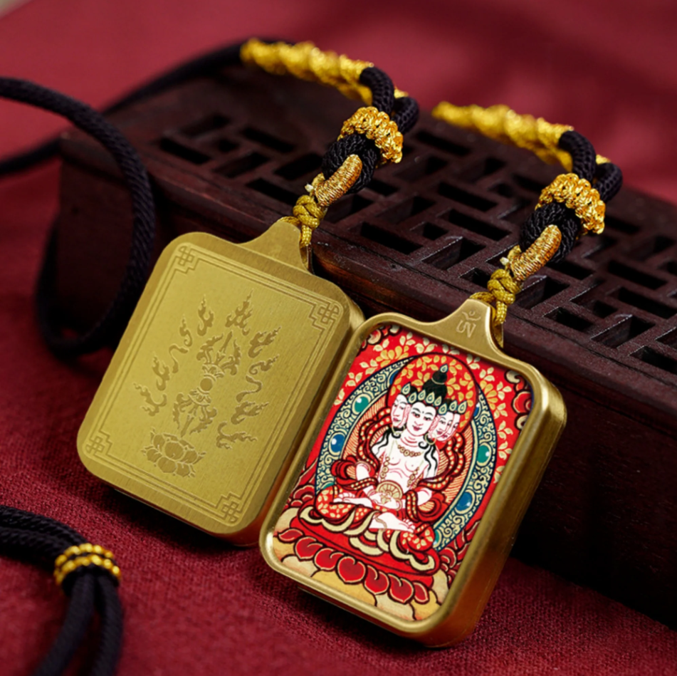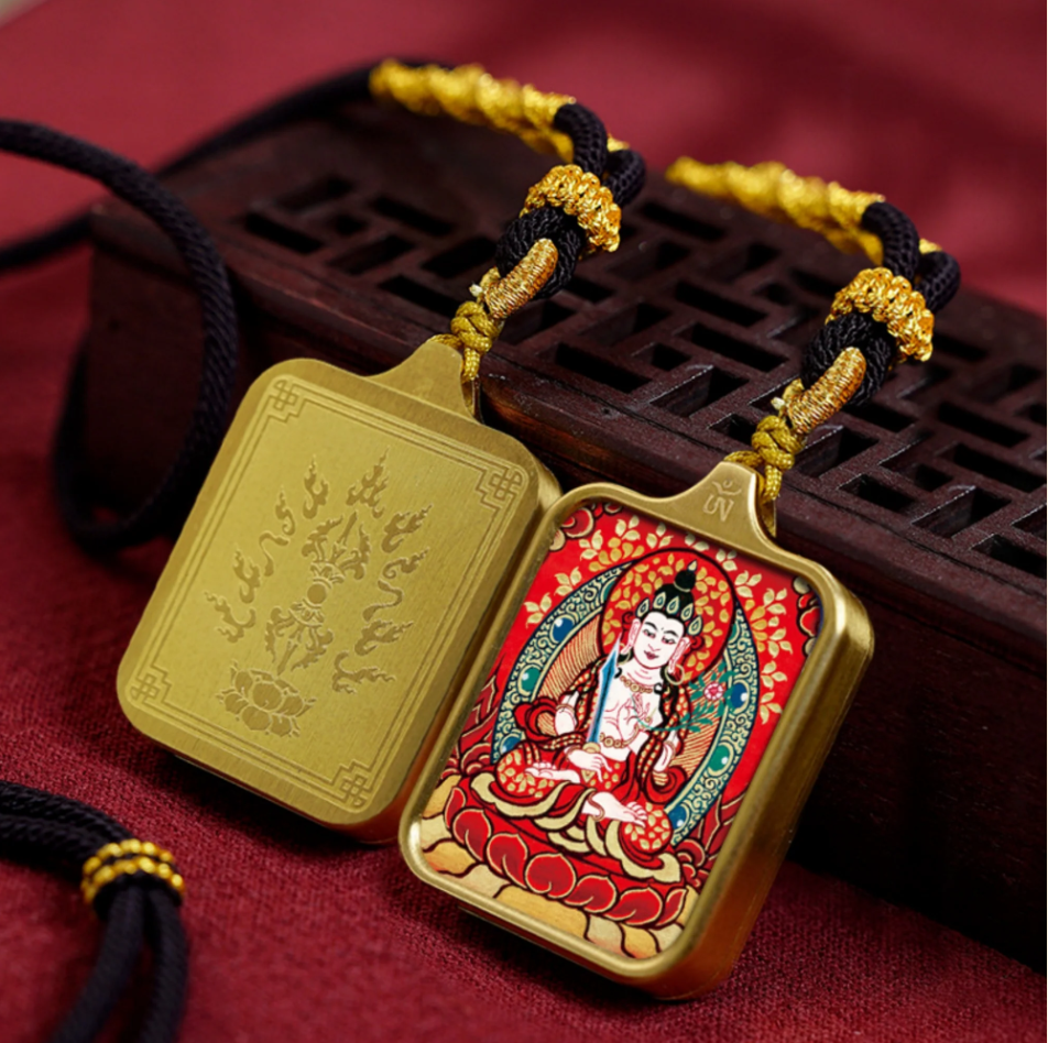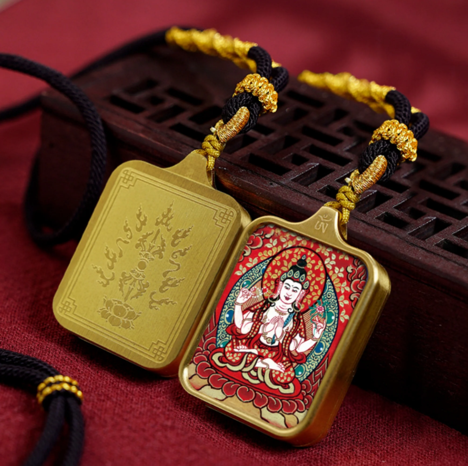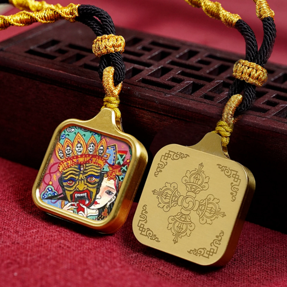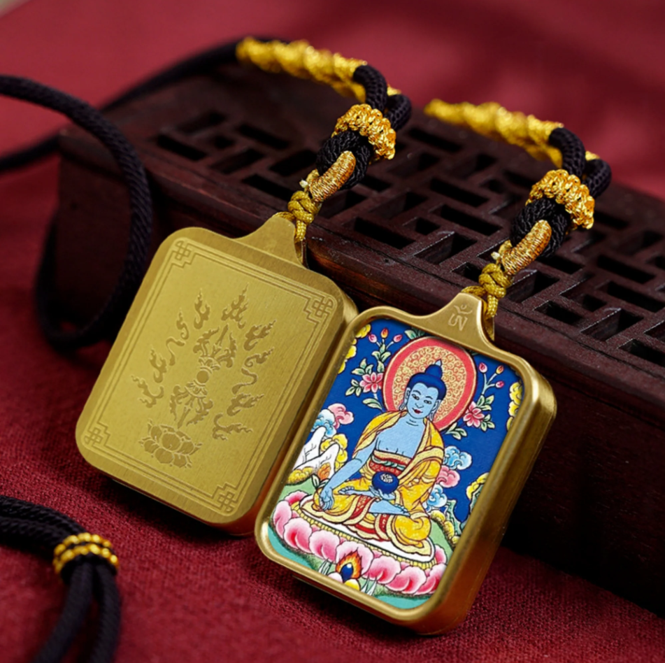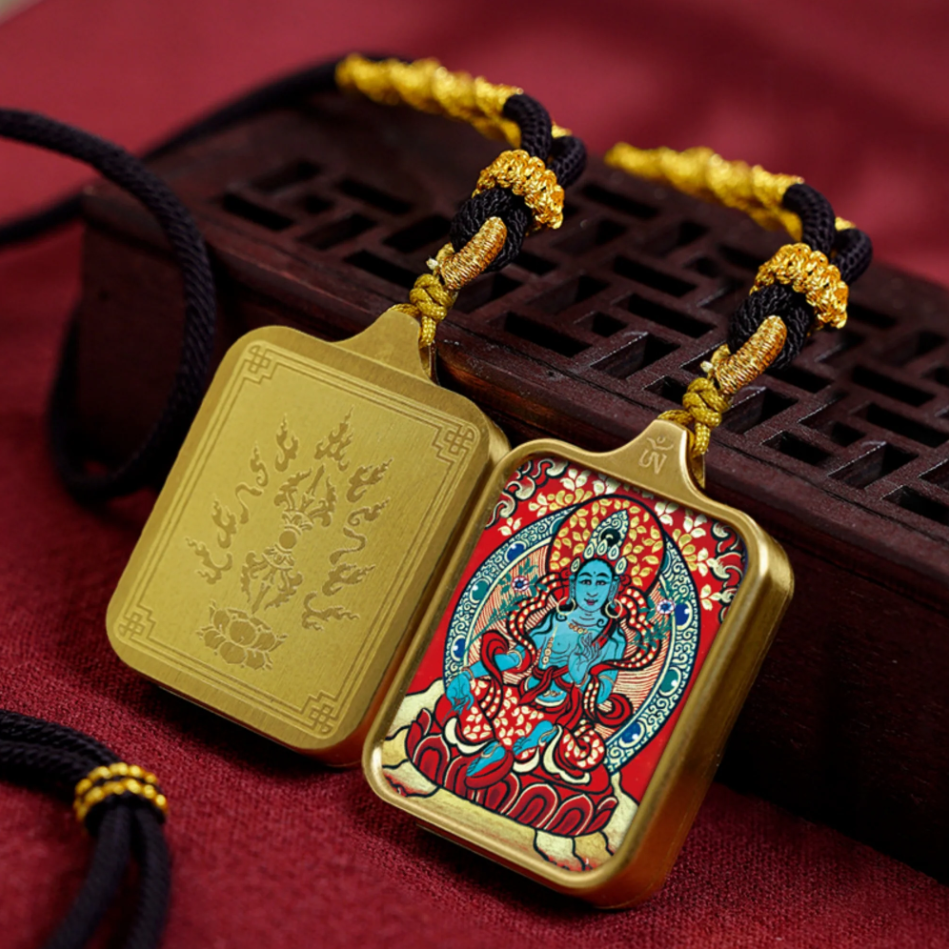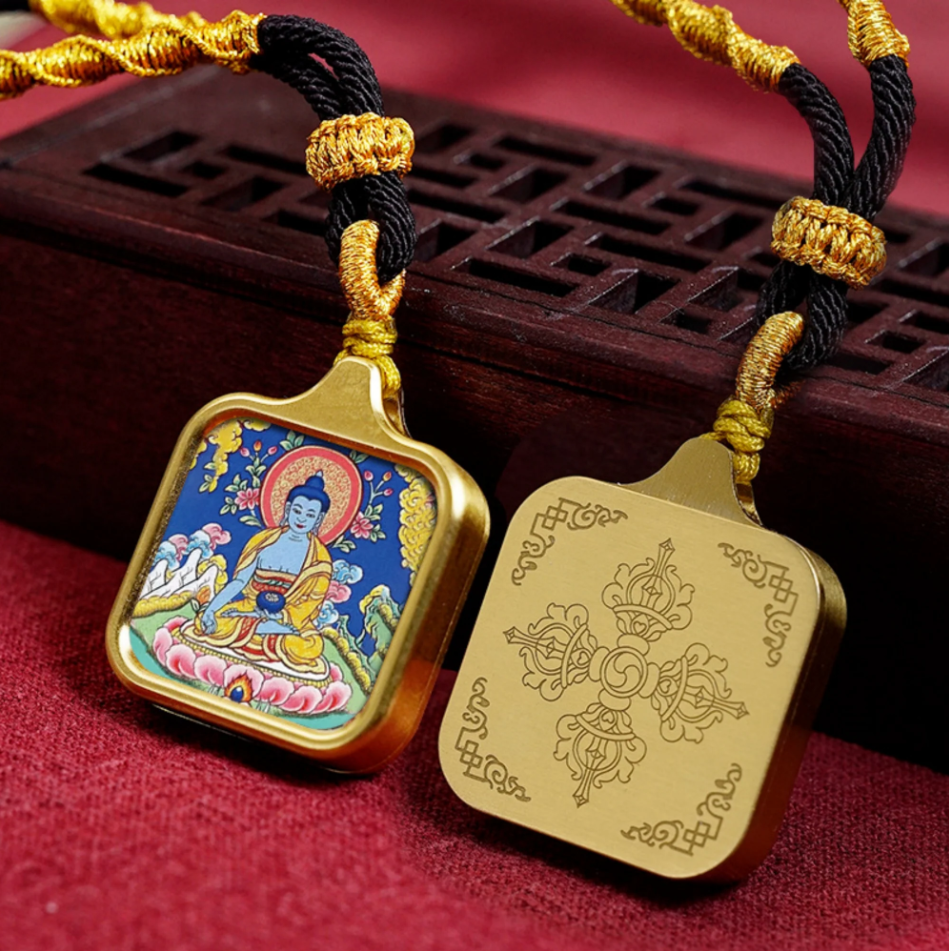 Hand-Painted Thangka: Each pendant is adorned with meticulously hand-painted Thangka, a traditional Tibetan Buddhist art form depicting sacred deities and symbols. These intricate designs showcase vibrant colors that represent the divine.