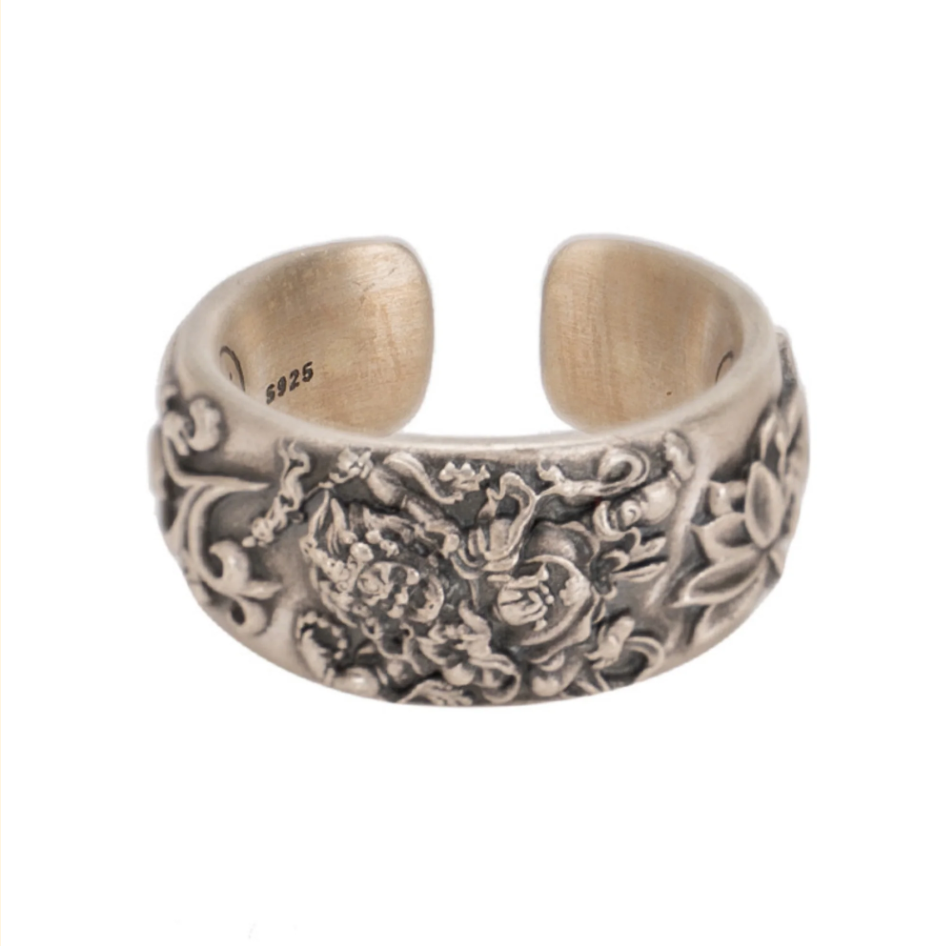 Handcrafted by Tibetan artisans, the Mahakala Tibetan Sterling Silver Ring is a symbol of spiritual strength and protection. Made from S925 sterling silver, this adjustable ring is designed to fit various finger sizes comfortably. The ring's design is inspired by Mahakala, the great protector deity in Tibetan Buddhism, revered for his powerful ability to ward off evil and bestow safety and good fortune. Wearing this ring is believed to harness the protective energy of Mahakala, ensuring peace and prosperity.