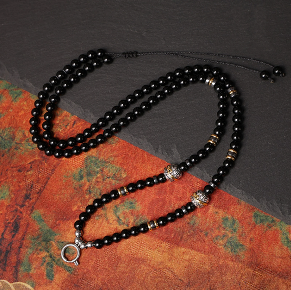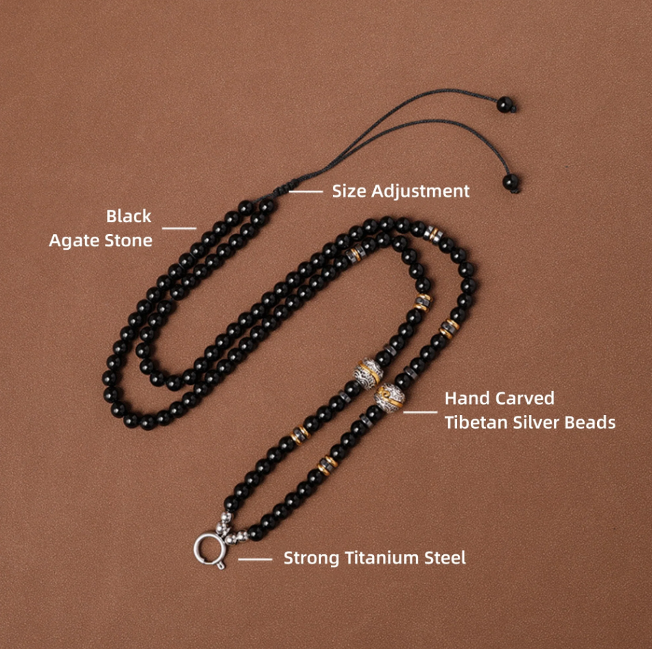 Natural Materials: Made from natural black agate and hand-carved Tibetan silver beads, ensuring a connection to the earth and traditional craftsmanship.